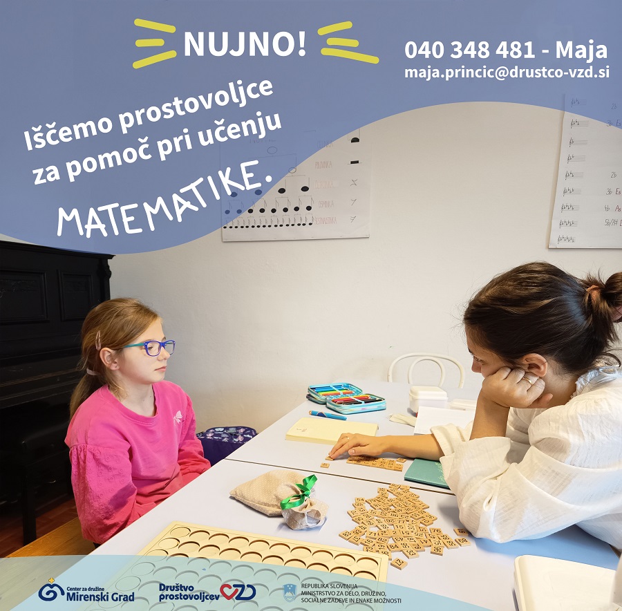 Iščemo prostovoljce za pomoč otrokom in mladim pri učenju matematike. Delo poteka v Centru za družine Mirenski Grad od ponedeljka do četrtka od 15.00 do 17.30/18.00 oz. od 16.00 do 18.30. Pomagaš lahko enkrat ali večkrat na teden. Za oddaljene otroke izvajamo tudi učno pomoč na daljavo v terminih od 15.00 do 17.00 oz. 18.00, zato je mogoča tudi pomoč na daljavo.