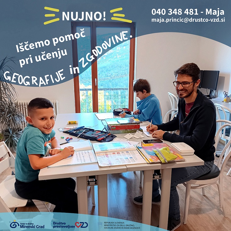 Iščemo prostovoljce za pomoč otrokom in mladim pri učenju geografije in zgodovine. Delo poteka v Centru za družine Mirenski Grad od ponedeljka do četrtka od 15.00 do 17.30/18.00 oz. od 16.00 do 18.30. Pomagaš lahko enkrat ali večkrat na teden.