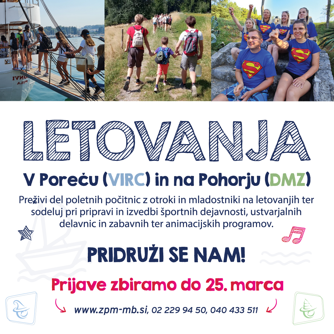 Opis dela Iščeš poletje, polno zabave, izkušenj in nepozabnih trenutkov? Pridruži se ekipi prostovoljcev na letovanjih ZPM Maribor v DMZ Pohorje ali VIRC Poreč in mladim pričaraj poletje, ki ga ne bodo nikoli pozabili!