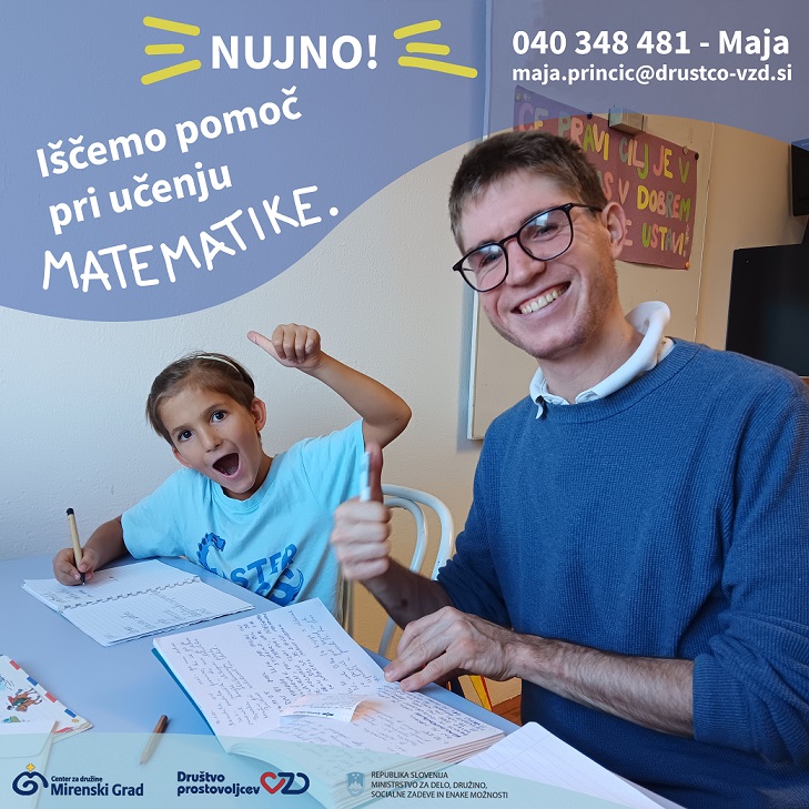 Iščemo prostovoljce za pomoč otrokom in mladim pri učenju matematike. Delo poteka v Centru za družine Mirenski Grad od ponedeljka do četrtka od 15.00 do 17.30/18.00 oz. od 16.00 do 18.30. Pomagaš lahko enkrat ali večkrat na teden.