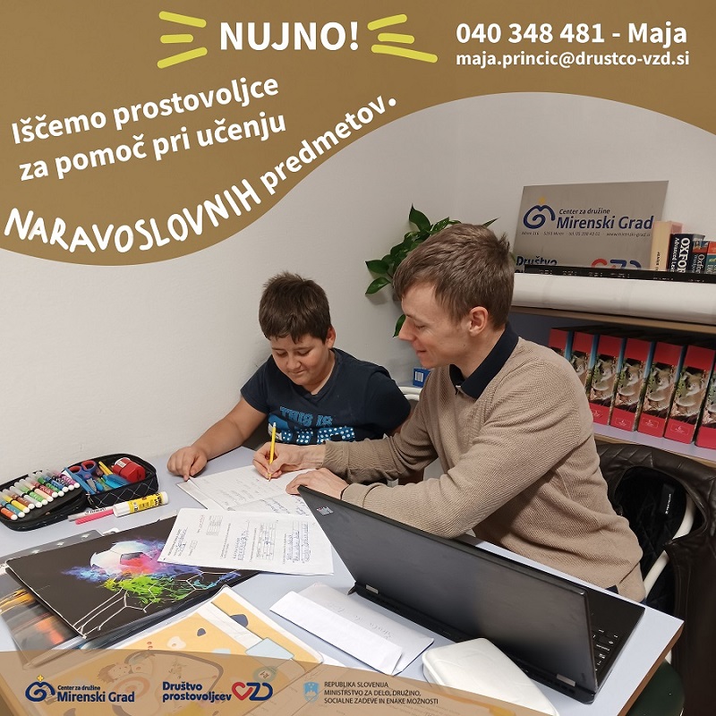 Iščemo prostovoljce za pomoč otrokom in mladim pri učenju naravoslovnih predmetov. Delo poteka v Centru za družine Mirenski Grad od ponedeljka do četrtka od 15.00 do 17.30/18.00 oz. od 16.00 do 18.30. Pomagaš lahko enkrat ali večkrat na teden. Za oddaljene otroke izvajamo tudi učno pomoč na daljavo v terminih od 15.00 do 17.00 oz. 18.00, zato je mogoča tudi pomoč na daljavo.