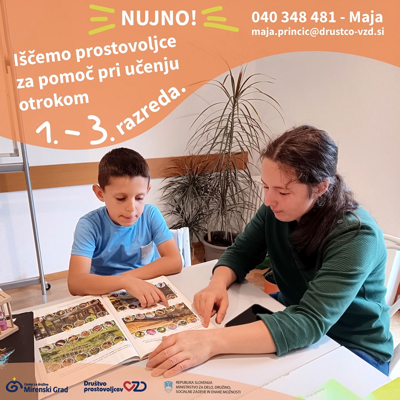Iščemo prostovoljce za pomoč otrokom v prvih treh razredih osnovne šole. Delo poteka v Centru za družine Mirenski Grad od ponedeljka do četrtka od 15.00 do 17.30/18.00 oz. od 16.00 do 18.30. Pomagaš lahko enkrat ali večkrat na teden.